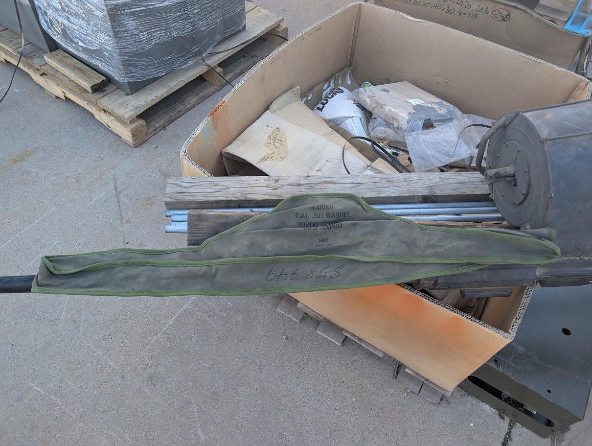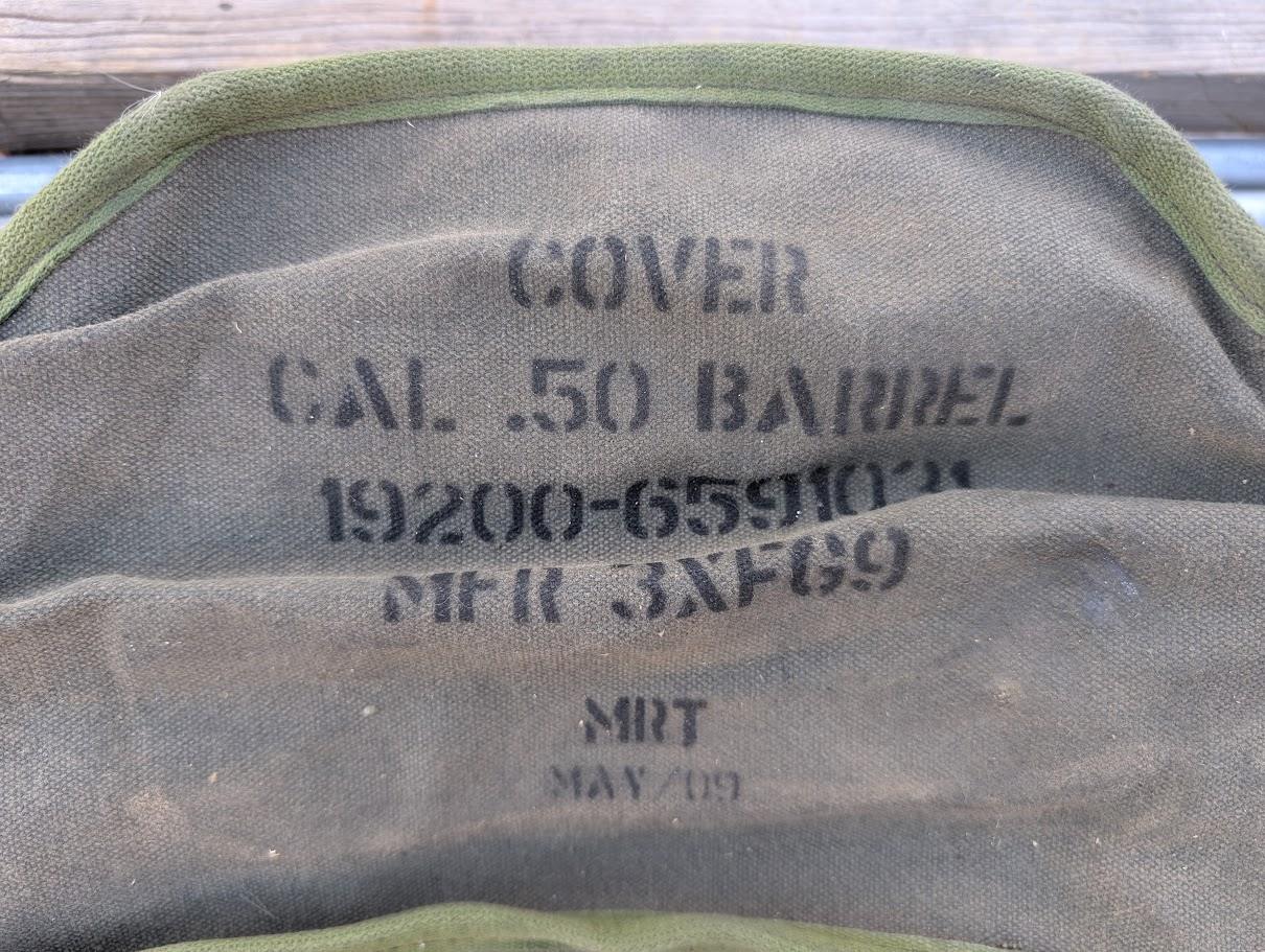 This authentic US Military-issue spare barrel cover (NSN 1005-00-659-1031) is designed specifically for .50 caliber machine guns like the M2 Browning. Crafted from durable, rugged canvas material in a classic dark green color, it provides reliable protection for spare barrels against dust, moisture, and scratches during storage or transport. Measuring approximately 44 inches in length with zipper along about 2/3 of the length for easy access. Looks like it bulges up for a carrying handle as well.