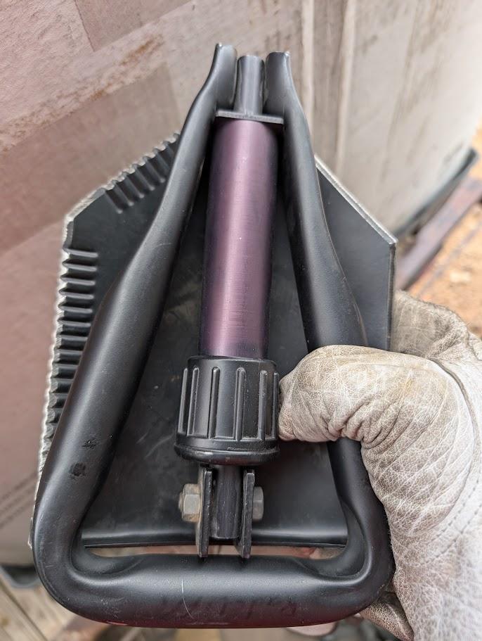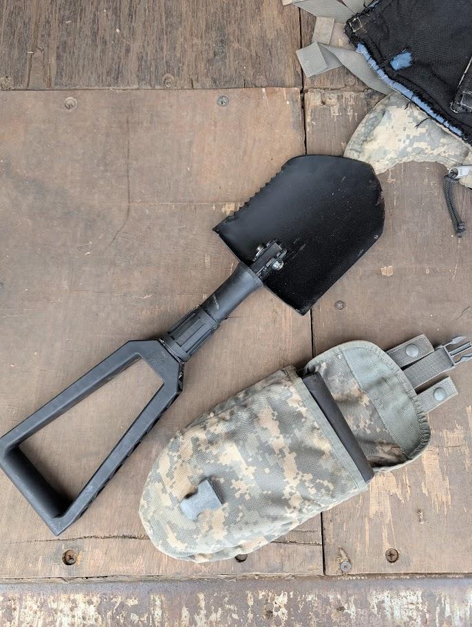 Military surplus Gerber brand E-tool with surplus UCP pattern carrier. Buckle closure on molle carrier. Absolutely mediocre for digging and chopping, positively terrible at cutting and sawing. A terrible prybar or hammer. Valued LARPers, mall crawlers, airsofters, and GWOT reenactors.