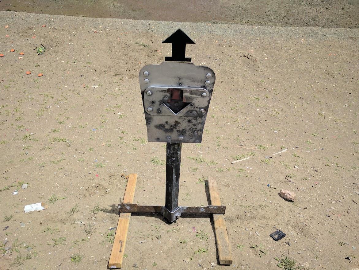 Target ships with hinge and stand fully welded. You’ll need to bolt the head and vitals target area to the hinge assembly, and the complete hinge assembly to the torso. The upper stand unit will need to be bolted to the torso as well. At that point, a couple lag bolts (provided as well) get put into 2×4″s (the only thing you need to provide), and you set the whole thing up, and shoot it. This sounds much more complicated than it is. You’ll get a nifty photo guide with your target. At 95 lbs shipped for the base model with stand, shipping is steep. Local pickup is available.