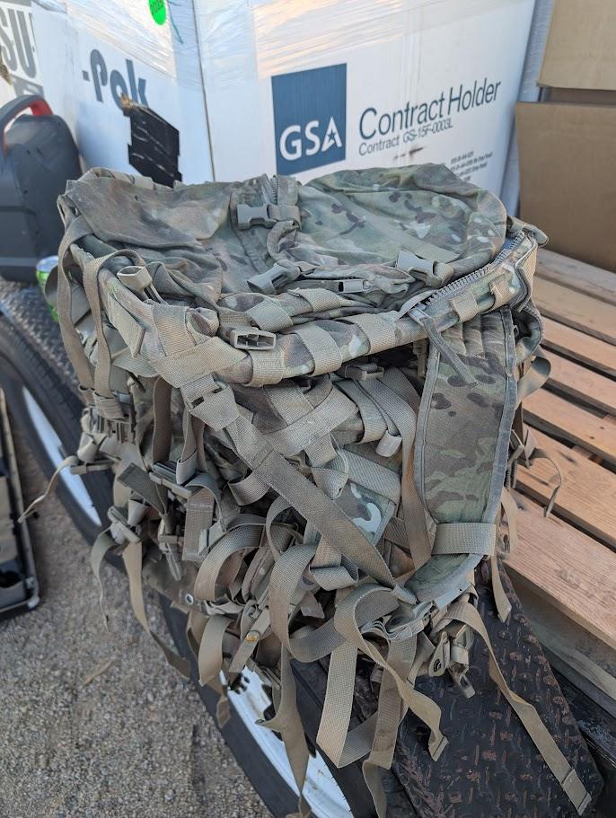 OCP pattern military surplus assault pack, also called three day pack. Nicely made of heavy duty material. Can be loaded with enough rocks to make it hard to move around. Four pounds. Used, condition varies from “probably worn once inside the office” to “Private Snuffy carried stinky socks in this”.