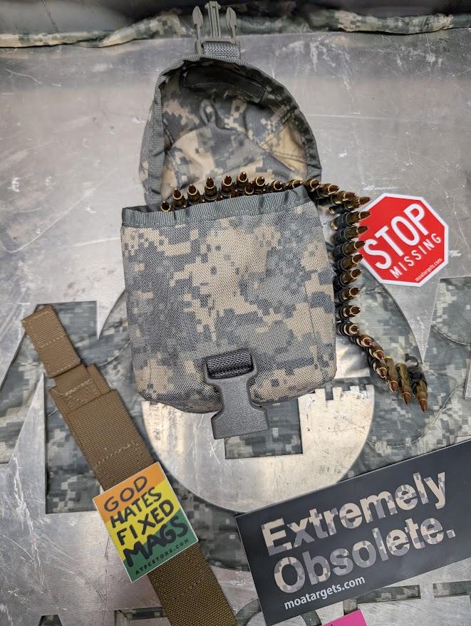 Military surplus UCP pattern 100 round SAW gunner pouch. This fits 100 rounds or a lot of chocolate bars.